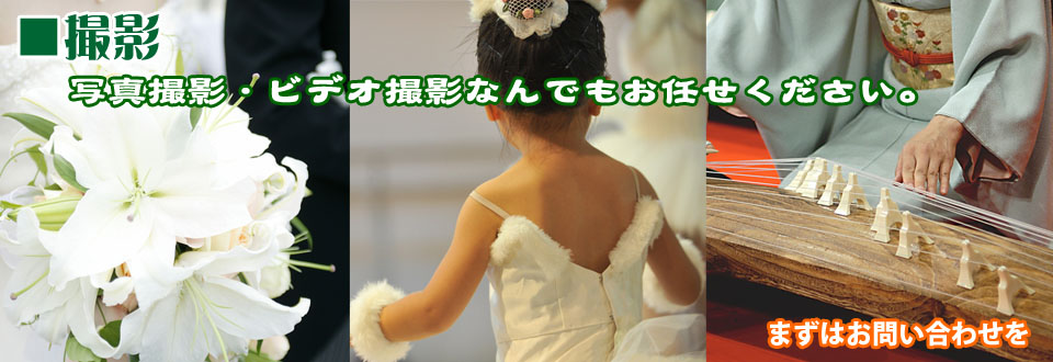 各種行事・ウェディング・パーティー・発表会など写真撮影・ビデオ撮影承ります。当社では創業以来、結婚式・コンサート・発表会・幼稚園・学校等様々なイベントを撮影してまいりました。長年の経験に基づいた信頼と実績のあるサービスを提供いたします。